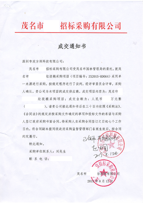 茂名市招標(biāo)采購有限公司成交通知書:
