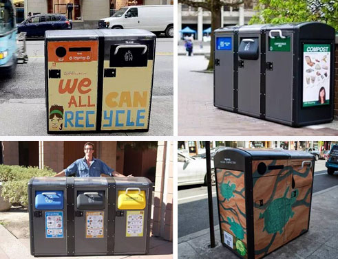 還有各種涂裝各種顏色,鋪主腦洞一開(kāi),要是在這垃圾桶上裝個(gè)顯示屏,是不是就變成了可視窗口?人流量那么大,賣廣告的話肯定也是無(wú)比的掙錢。